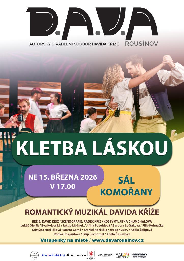 Přijďte si vychutnat romantický muzikál 'KLETBA LÁSKOU' v podání Autorského divadelního souboru Davida Kříže. Představení se koná 15. března 2026 od 17:00 hodin v sále v Komořanech. Těšit se můžete na profesionální režii Davida Kříže a scénografii Radka Kříže. Vstupenky zakoupíte na místě.